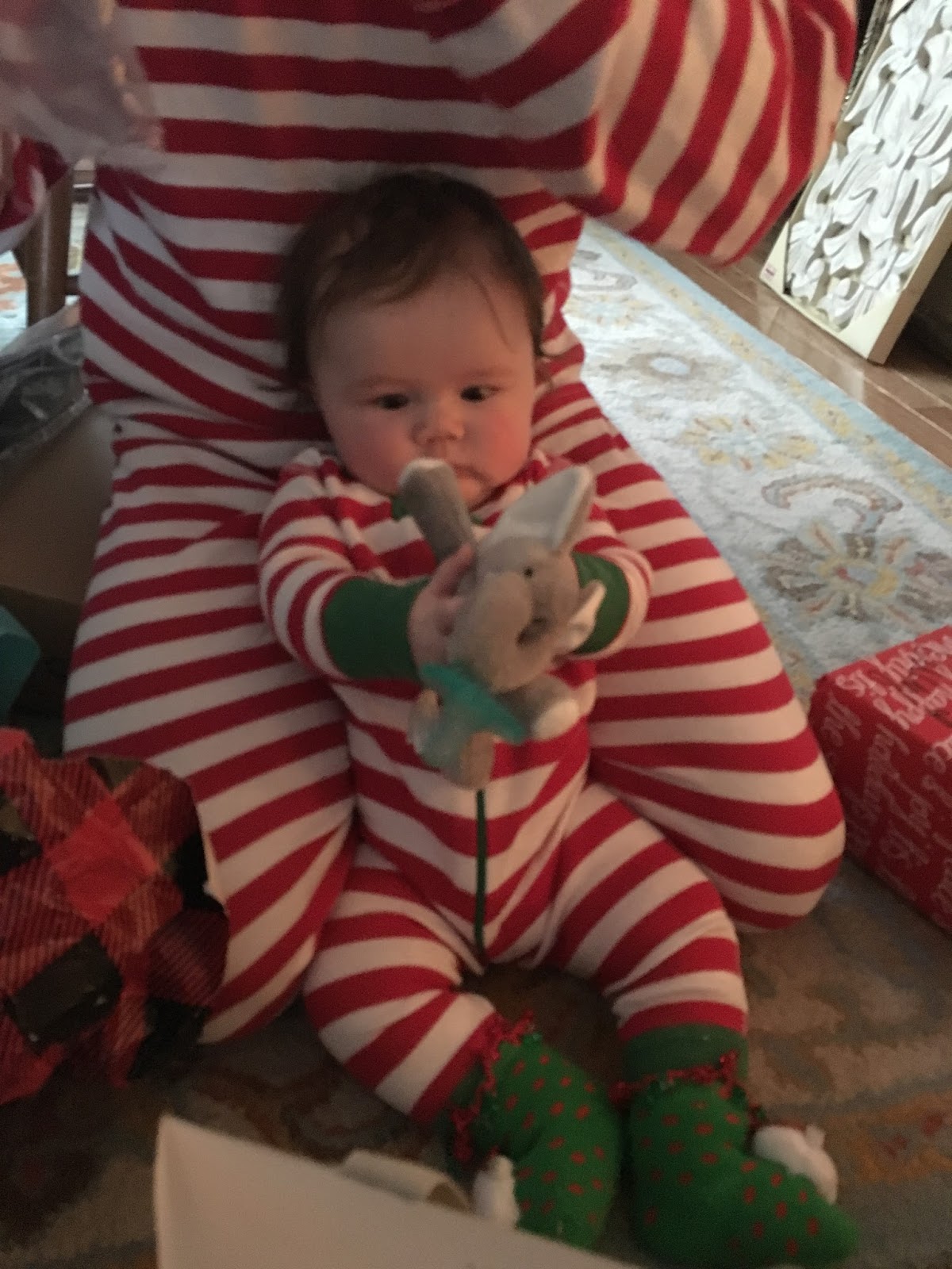 so excited about her new wubba that she went cross-eyed! other than wrapping paper, this was by far her favorite gift. and oh my god aren't her socks too cute?? my neighbor Tracy bought them and another pair at a craft fair. these ones have a big ol' santa head on the toes that she loves to grab at :)